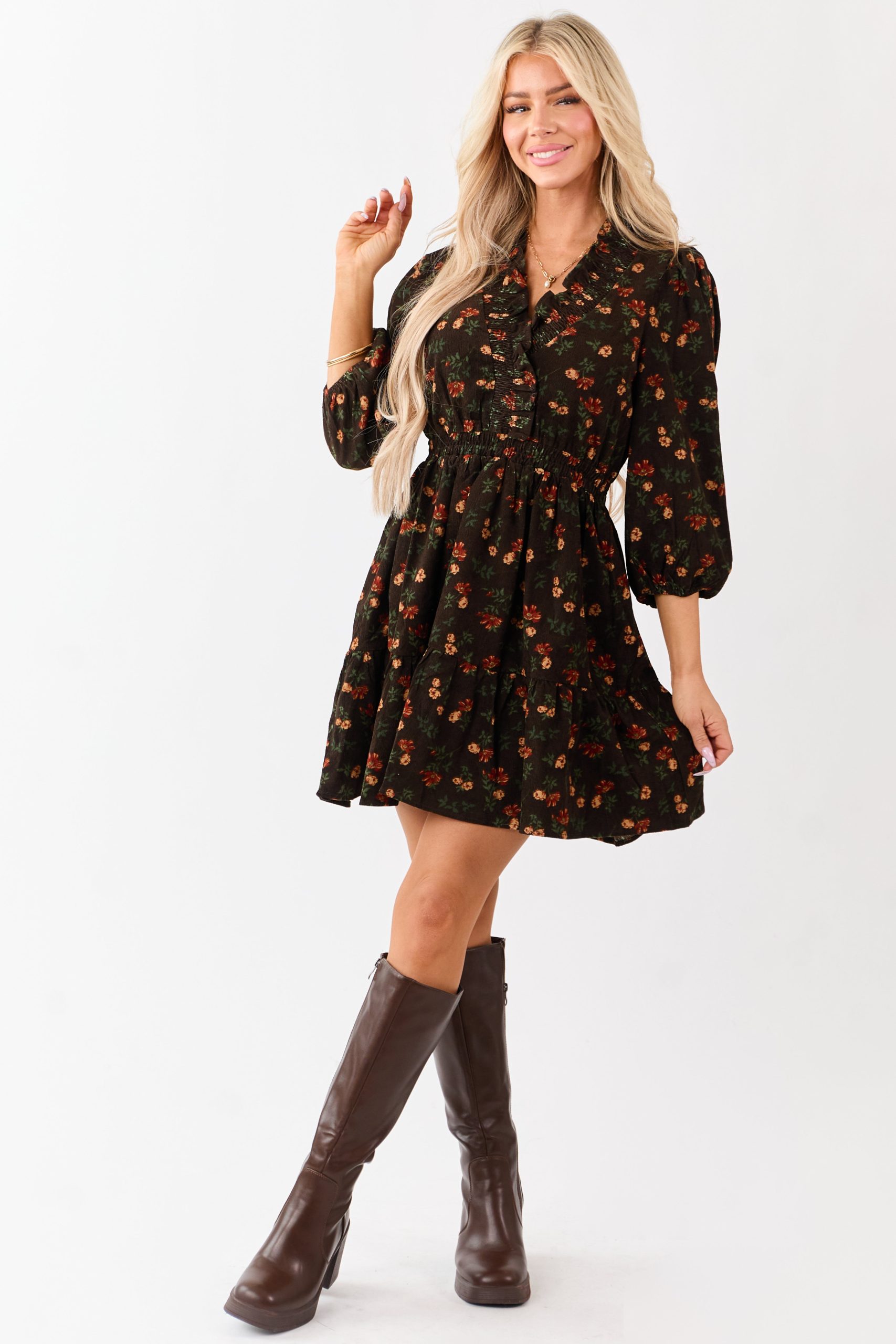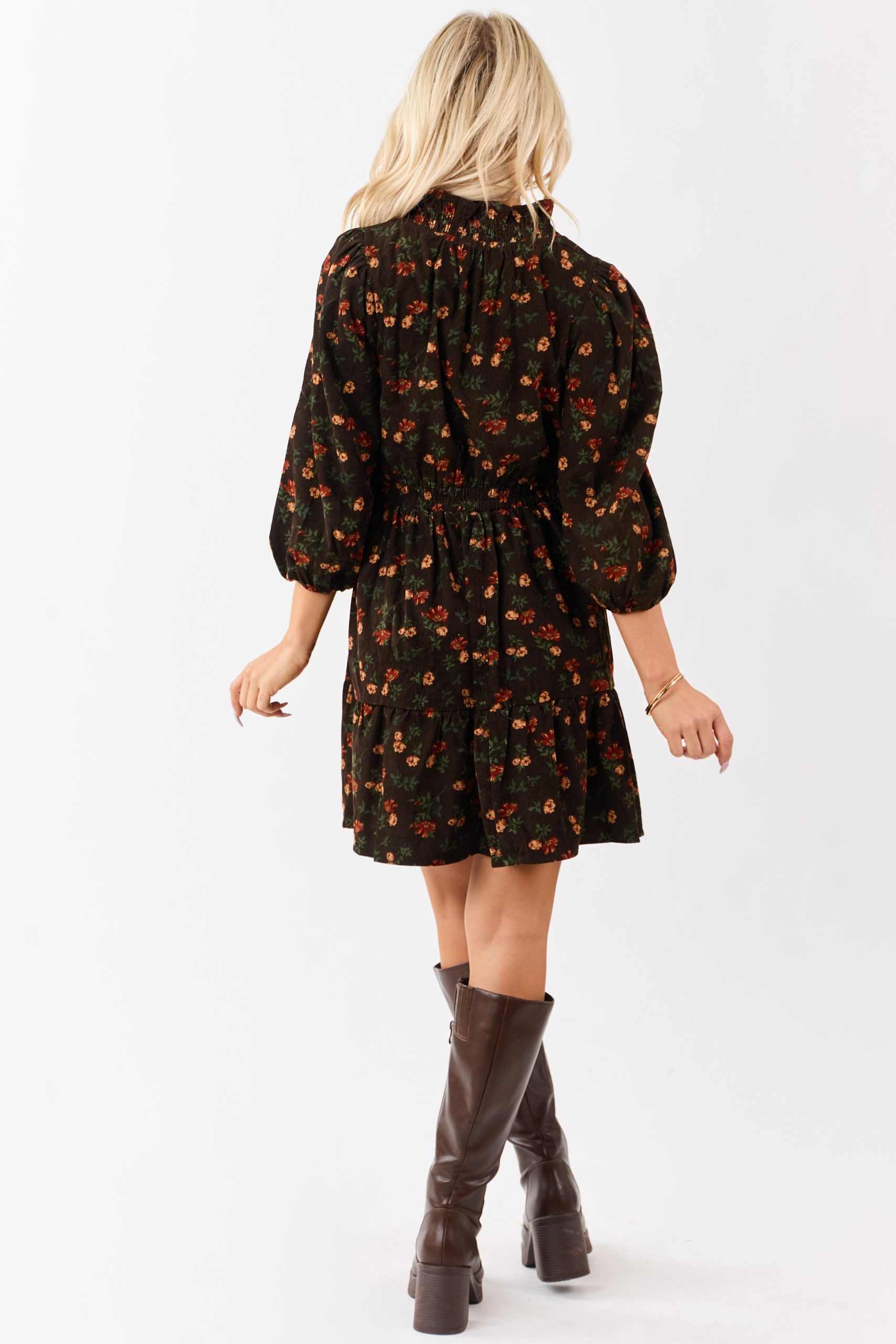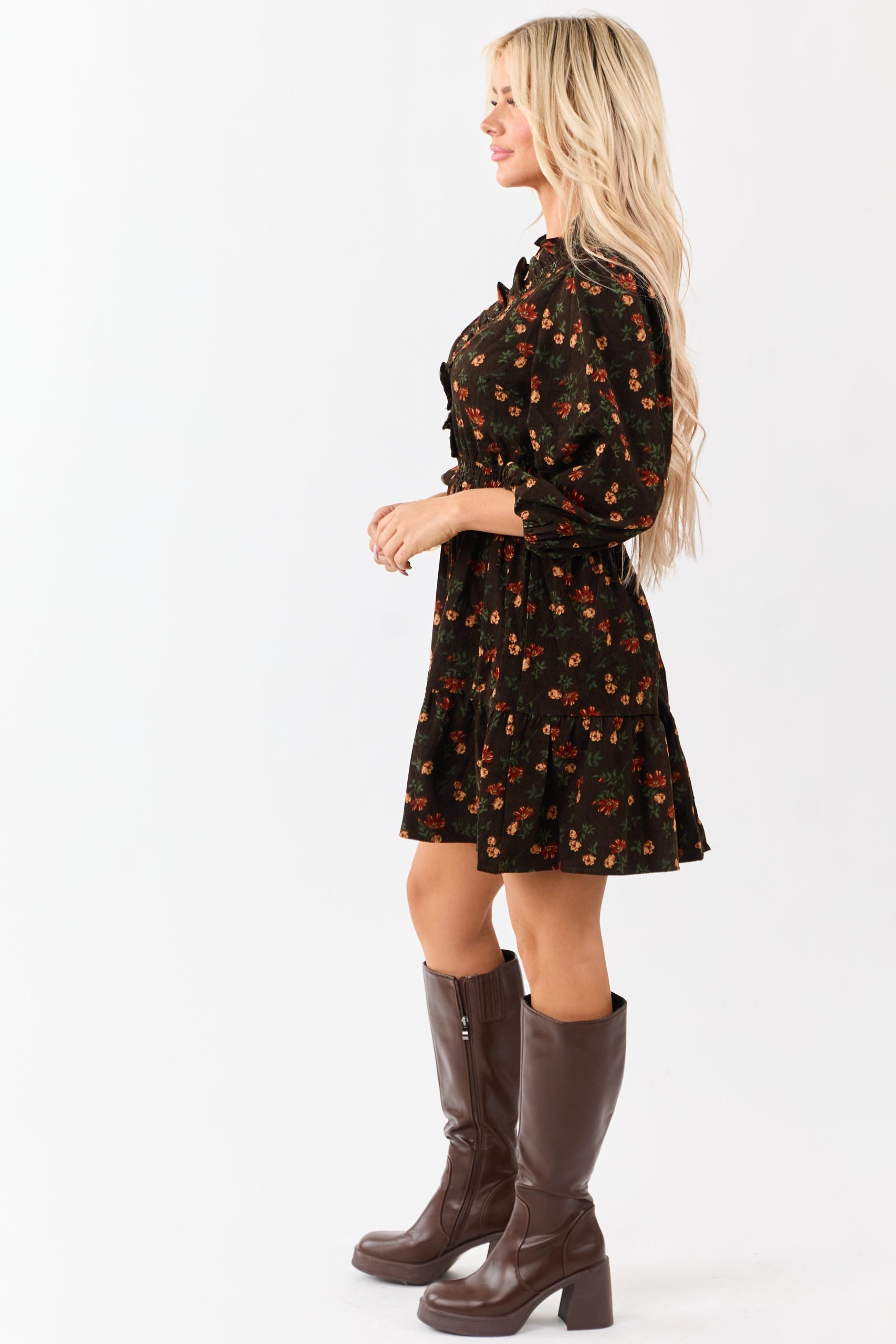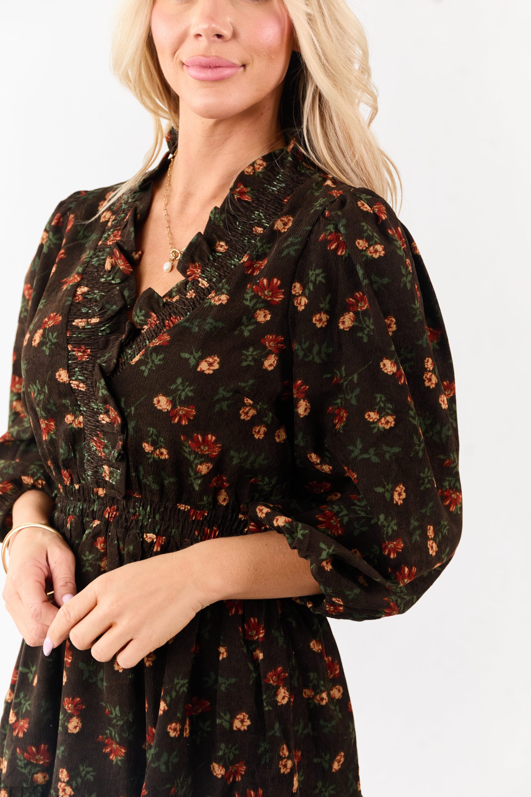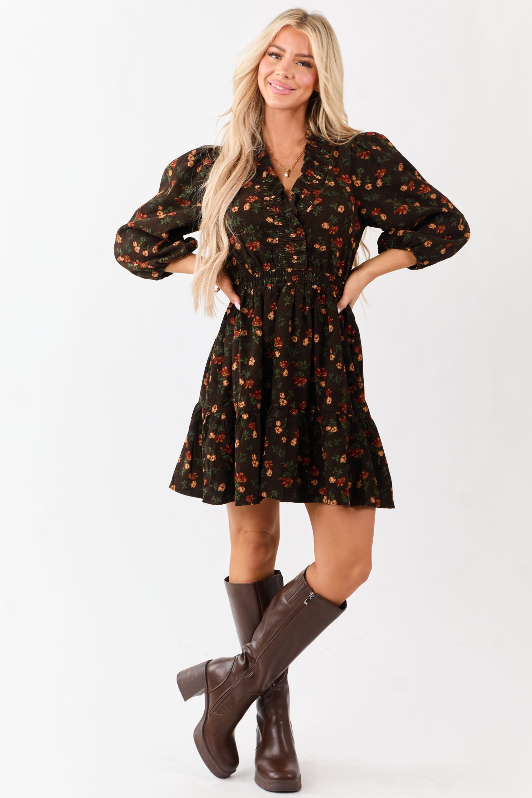 - Textured corduroy and a ruffled surplice neckline make this floral mini as cozy as it is captivating.